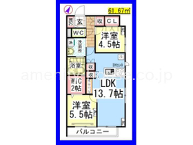 | 間取り | 2LDK 南東向き | 専有面積 | 61.67m 2 ( 18.65坪 ) |