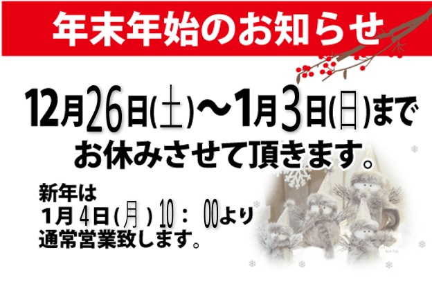 1年間たくさんのお問合せ・ご契約ありがとうございました!! 2020年12月26日(土)~2020年1月3日(日)まで、年末年始休暇とさせて頂きます。 新年は、
