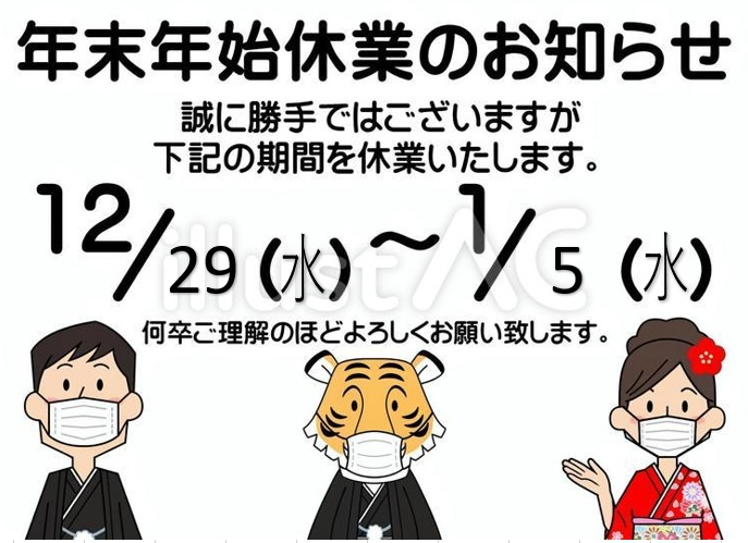 1年間たくさんのお問合せ・ご契約ありがとうございました!! 2021年12月29日(水)~2020年1月5日(水)まで、年末年始休暇とさせて頂きます。 新年は、